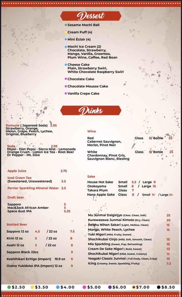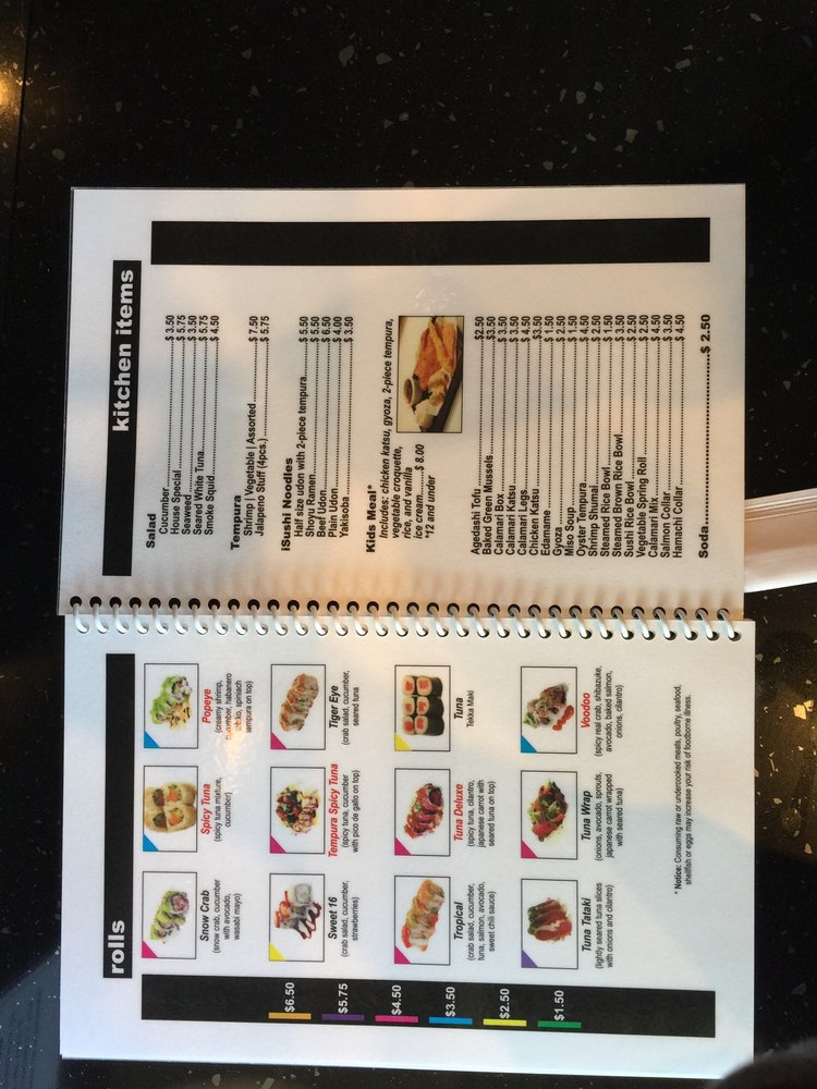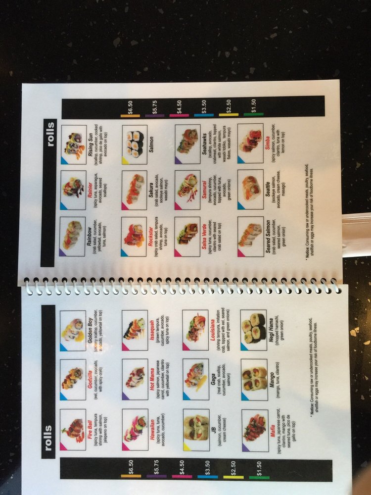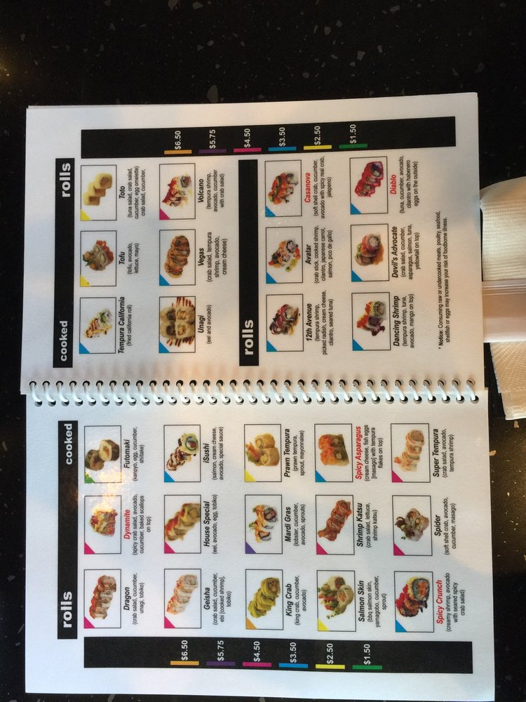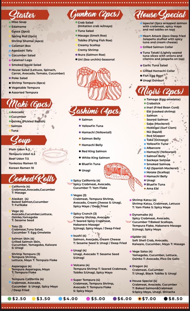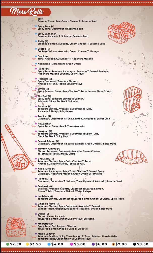 Shrimp Tempura, Cream Cheese, JalapenoT: Unagi, Avocado, TobikoS: Shiracha, Unagi
