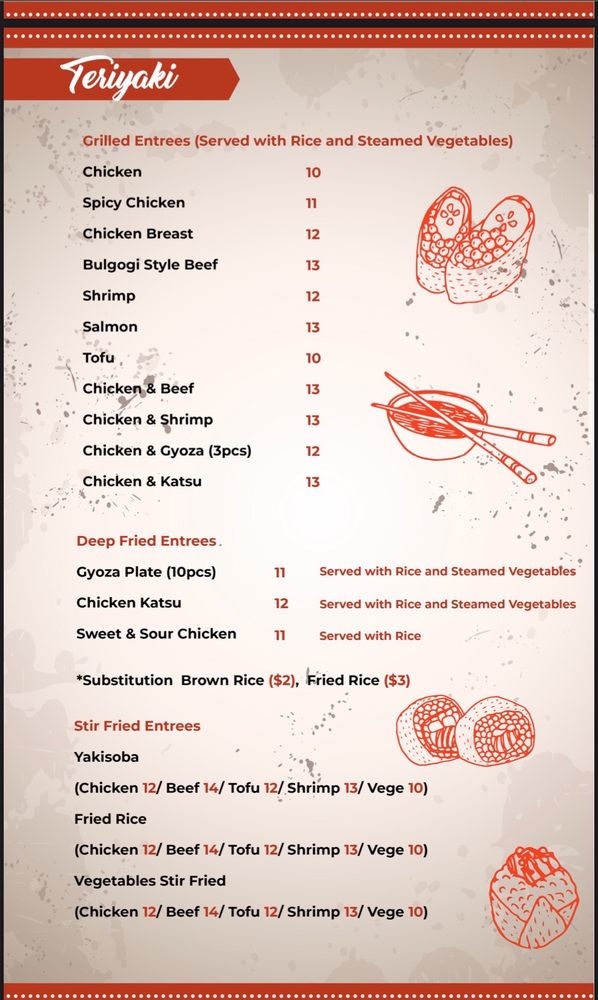 Chicken teriyaki, rice, 3 pieces gyoza, 4 pieces California rolls.